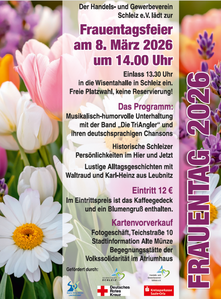 Der Handels- und Gewerbeverein Schleiz ist auch in diesem Jahr Gastgeber der traditionellen Frauentagsfeier. Diese findet am Sonntag, dem 8. März, in der Wisentahalle Schleiz statt. Ab 13:30 Uhr sind […]